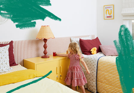 Color is central to everything Mustard Made does, and if the idea of a bold locker feels like a commitment, Becca's advice is simply to start small. One or two accent pieces against a neutral base is all it takes. "Adding a few little pops in one or two highlight colors will keep the space feeling cohesive," she says — and once you see what a single cheerful piece does to a room, you'll want more. Her favorite combinations: Ocean, Olive, and Sage for a nursery that feels calm and timeless. Butter and Mustard for a warm, inviting playroom, with a pop of Poppy if you want to turn up the energy. And for a bedroom that leans pink without going overboard, Blush, Berry, and Poppy together — the palette Jess used for her own daughter's room — is just right.