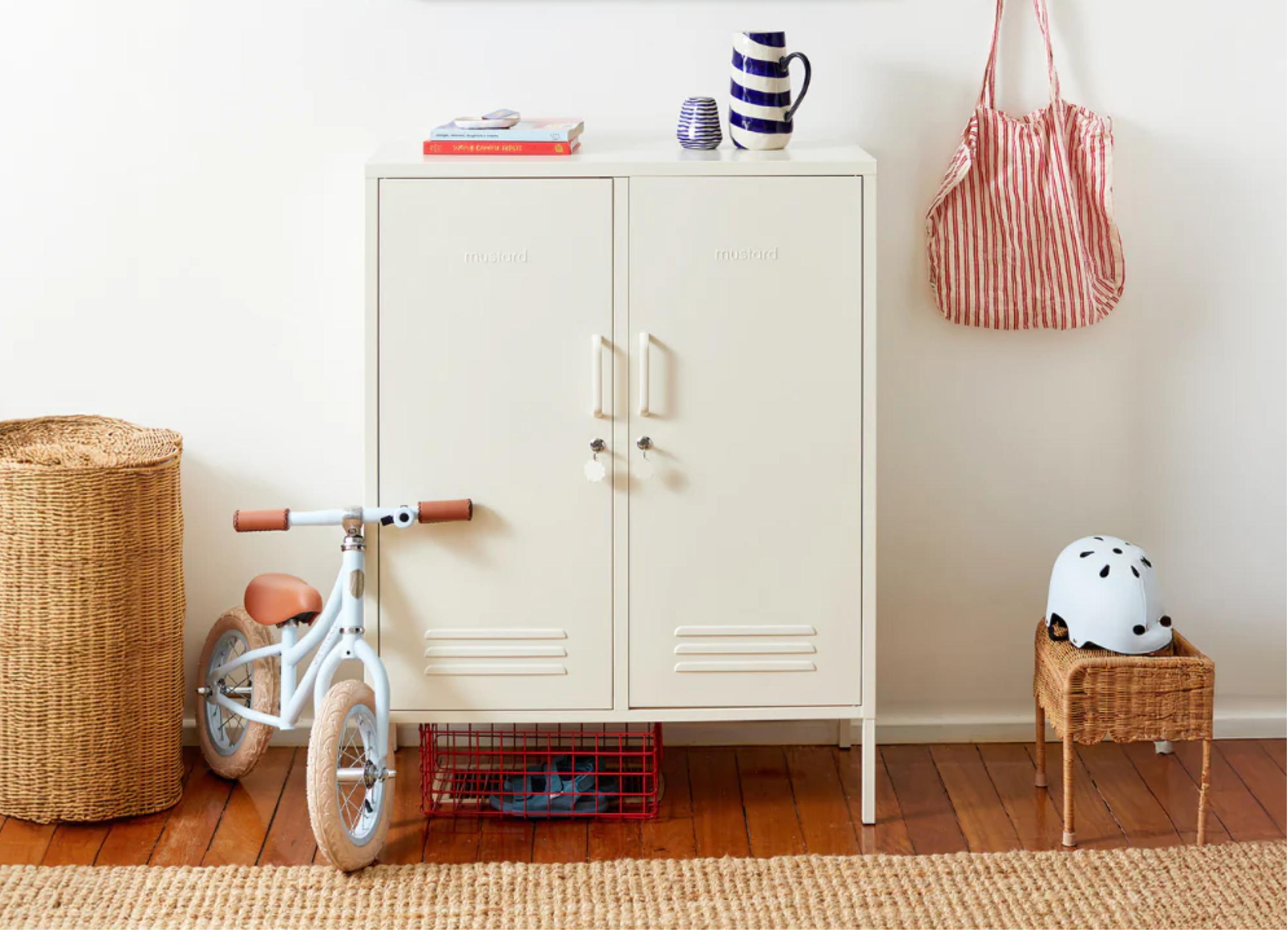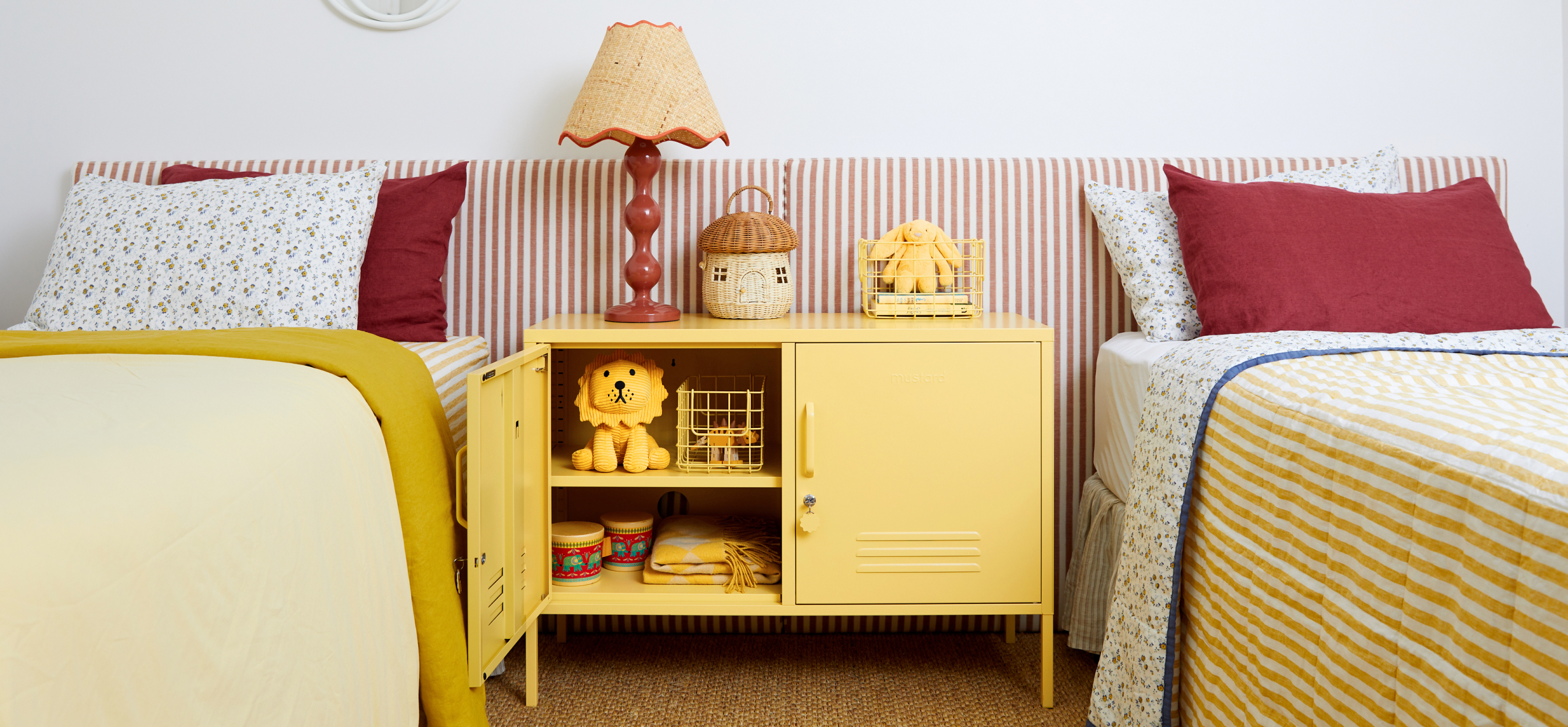 Good materials matter here. Mustard Made uses powder -coated steel precisely because it holds its color and stands up to years of use — no fading, no sad-looking furniture that needs replacing before your kid hits middle school. "Kids tend to love color," Becca points out, "so letting them choose their favorite is a great way to let them put their own stamp on their space." The locker is her go-to example of a truly multi-stage piece: "We love that it can work as toy storage, a wardrobe, to store sports equipment — and even move out with them when they go to college."